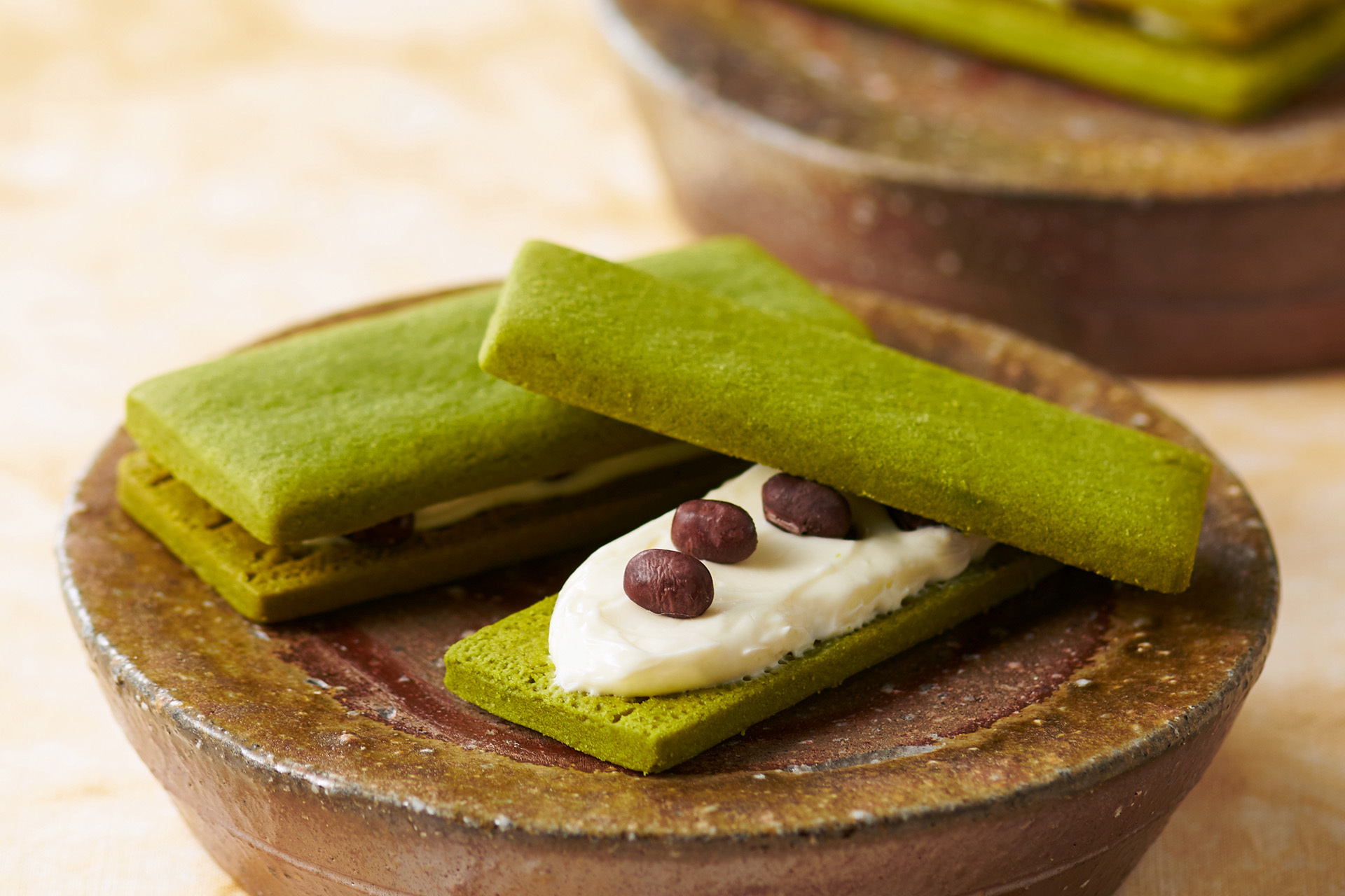 国産の米粉を使用した抹茶サブレで、ホワイトチョコレートを加えたクリームと北海道産小豆を挟んだ「宇治抹茶クリームサンド」。抹茶サブレの繊細な食感を保つため、配合と焼き加減、クリームの量とのバランスに試作を重ねました。