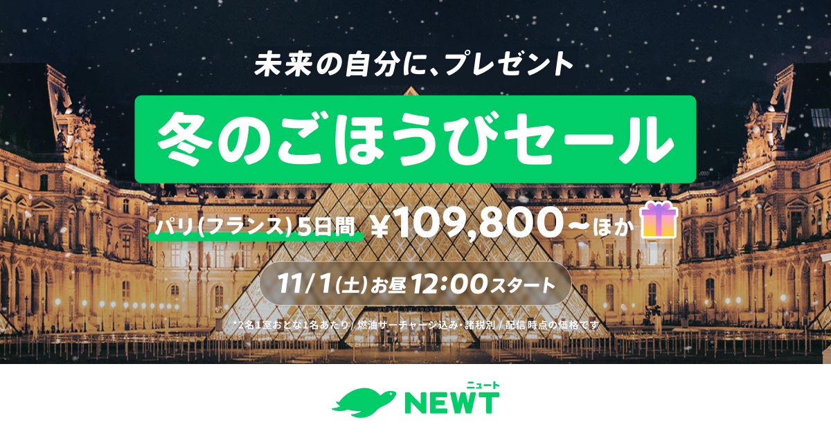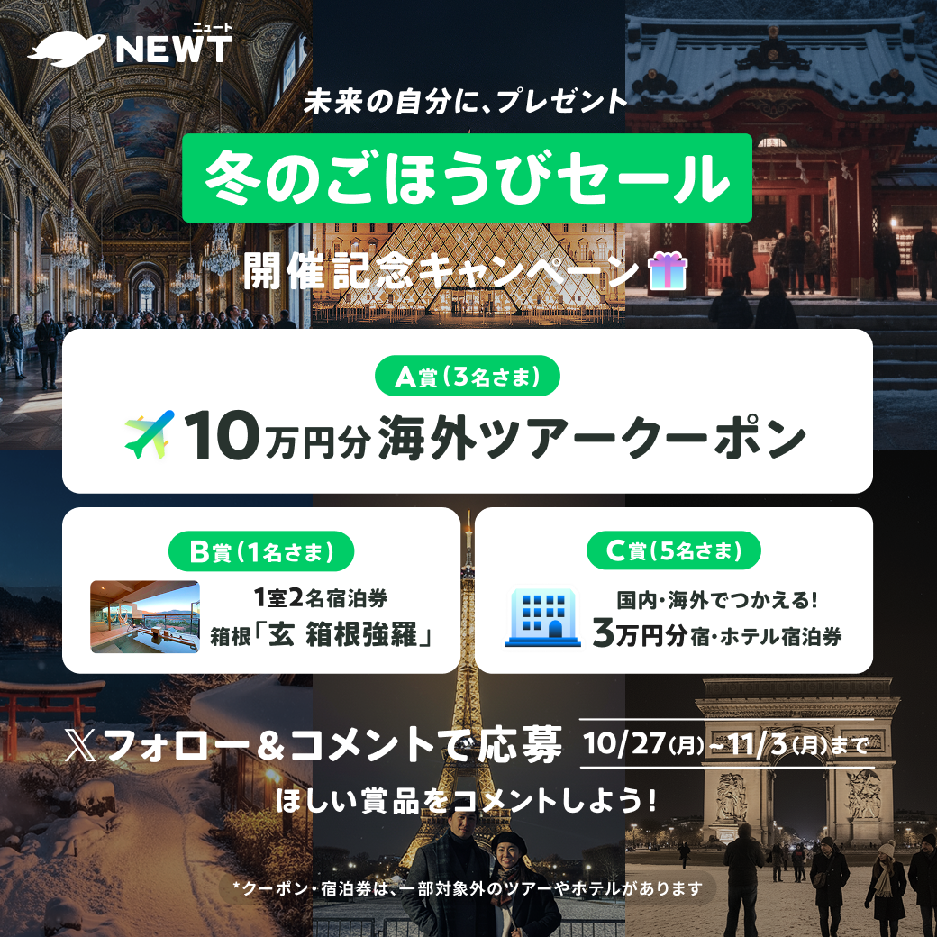 株式会社令和トラベル(本社:東京都渋谷区、代表取締役:篠塚 孝哉)が運営する、かしこい、おトク、旅行アプリ『NEWT(ニュート)』では、年末年始の旅行や、卒業旅行シーズンに向けて、『冬のごほうびセール』を2025年11月1日12:00から開催いたします。さらに、今回のセールでは、NEWT初となる添乗員同行のツアーも販売いたします。