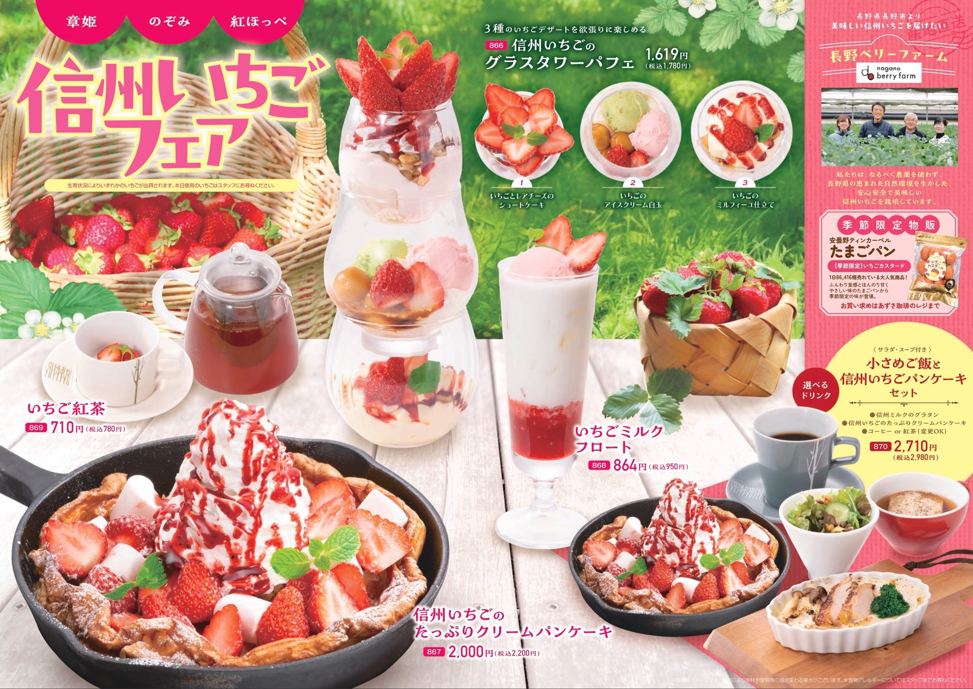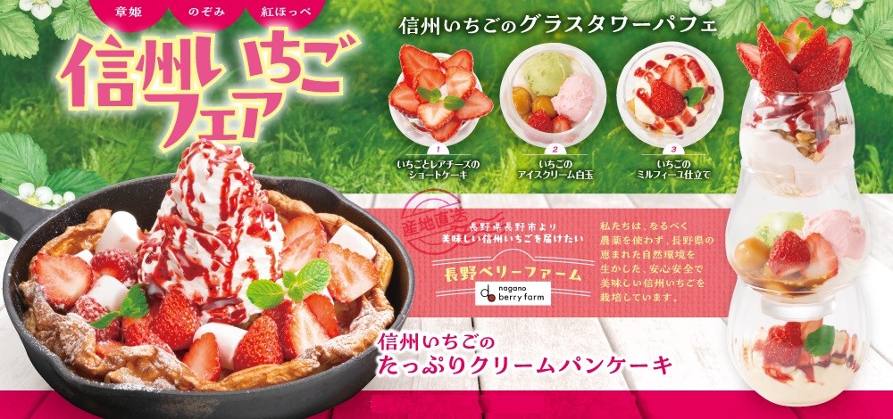 人気の信州ミルクのパンケーキに盛り付けた「信州いちごのたっぷりクリームパンケーキ」や見た目もプレミアム!三段でそれぞれ味わえる!「信州いちごのグラスタワーパフェ」。信州の濃厚な牛乳を使った「いちごミルクフロート」などプレミアムメニューのフェアです。