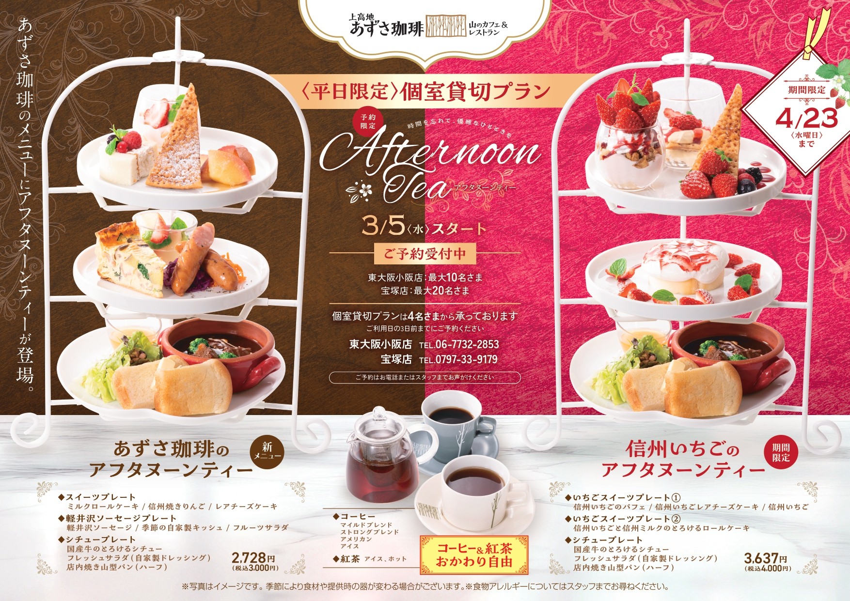 宝塚店・東大阪小阪店では珈琲・紅茶飲み放題付!個室確約プランのアフタヌーンティーを開始致します!