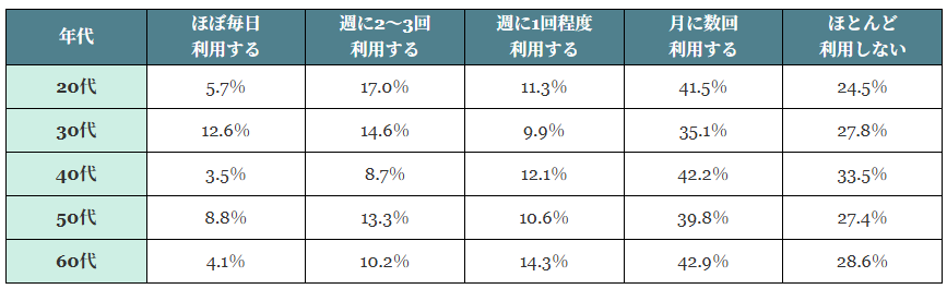 特に、若い世代でフリーWi-Fiの認知度が高く、利用率が高いことがうかがえます。さらに「月に数回利用する」を加えた合計値は、世代全体を通して70%に上りました。