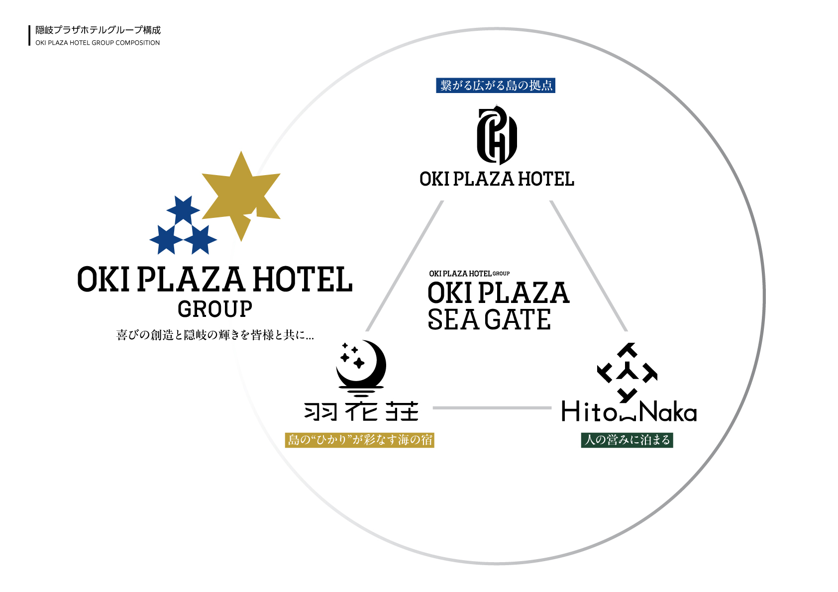 隠岐プラザホテルグループは、3つのタイプの宿泊施設を運営しています。隠岐諸島を旅する方の入り口“ SEAGATE ”であることを使命とし、隠岐諸島の人、自然、文化をめぐる拠点として、開かれたホテルを創っていきます。今回のリニューアルを機に、新しく生まれ変わる隠岐プラザホテルを中心にグループ全体のロゴとそれぞれの施設の新しいロゴマークを打ち出し、企業リブランディングを図り、再出発をします。
