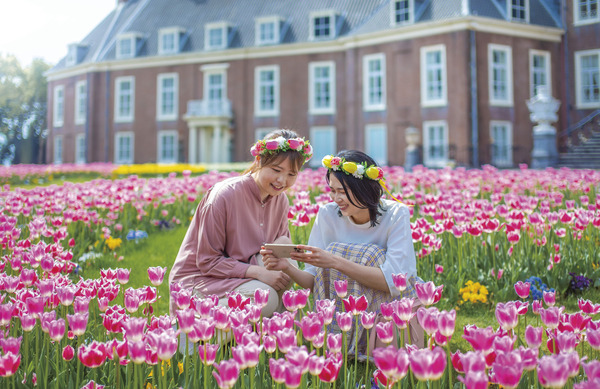 春のチューリップをはじめ、バラやひまわりなど、季節ごとに異なる花々が場内を彩るハウステンボス。なかでも、春に開催される「チューリップセレブレーション」では、色とりどりの花畑と風車がオランダの風景を彷彿とさせ、フォトジェニックな景観を楽しめます。