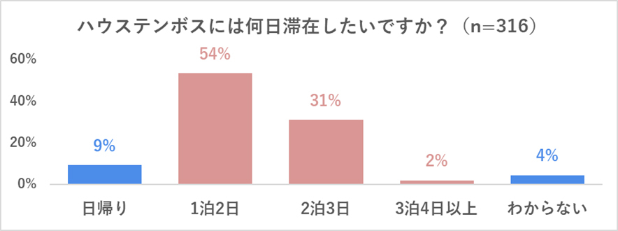 ハウステンボスには、それぞれ異なるコンセプトを持つ5つのオフィシャルホテルがあります。アンケート結果によると、全体の8割以上がハウステンボスで1泊2日以上の滞在を希望しており、宿泊も旅の醍醐味のひとつになるといえるでしょう。