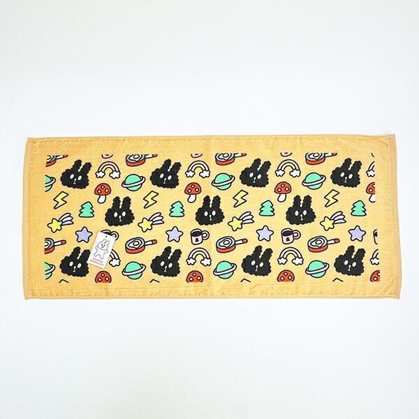 こちらは、バニーコンビニ マヨくんと虹のフェイスタオルです。黄色にカラフルなモチーフで遠くからみても目を引くデザインです。お家にかけておくだけで一気にお風呂場などの雰囲気も明るくなりそうです。