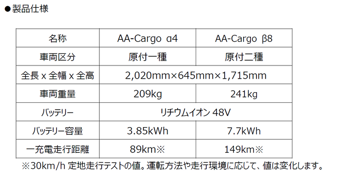 aidea社が販売する商用3輪電動バイク「AA-Cargo α4/β8」は、既存バイクメーカー以外では初となる型式認定を取得し、国※1および東京都※2からエコカーや電動バイク普及促進の補助金対象車両として指定されるとともに、国内の宅配便業界や大手外食チェーンなどに導入されています。また、2023年に発売予定の2輪の電動バイク「AA-wizシリーズ」は、他社比約1.5倍容量のバッテリーを搭載することで、全⻑や重量は同等でありながら、一充電走行距離が他社製品に比べて長い走行性能を目指しています。