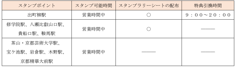 掲出駅 出町柳駅、茶山・京都芸術大学駅、修学院駅、宝ケ池駅、八瀬比叡山口駅、岩倉駅、木野駅、京都精華大前駅、貴船口駅、鞍馬駅