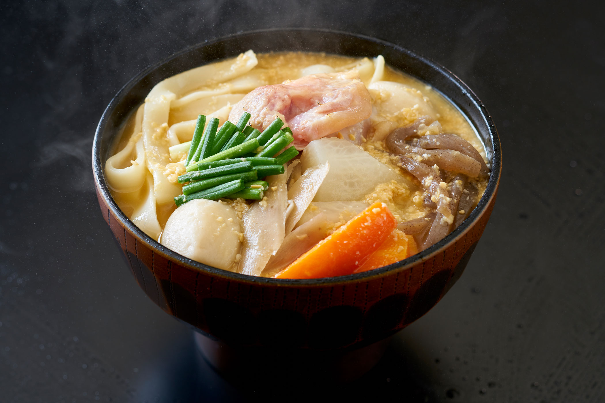 右)平たくのばしただんごとたっぷりの季節の野菜を入れた、大分県を代表する郷土料理のひとつ「だんご汁」。 ほっと身体が温まる一品です。