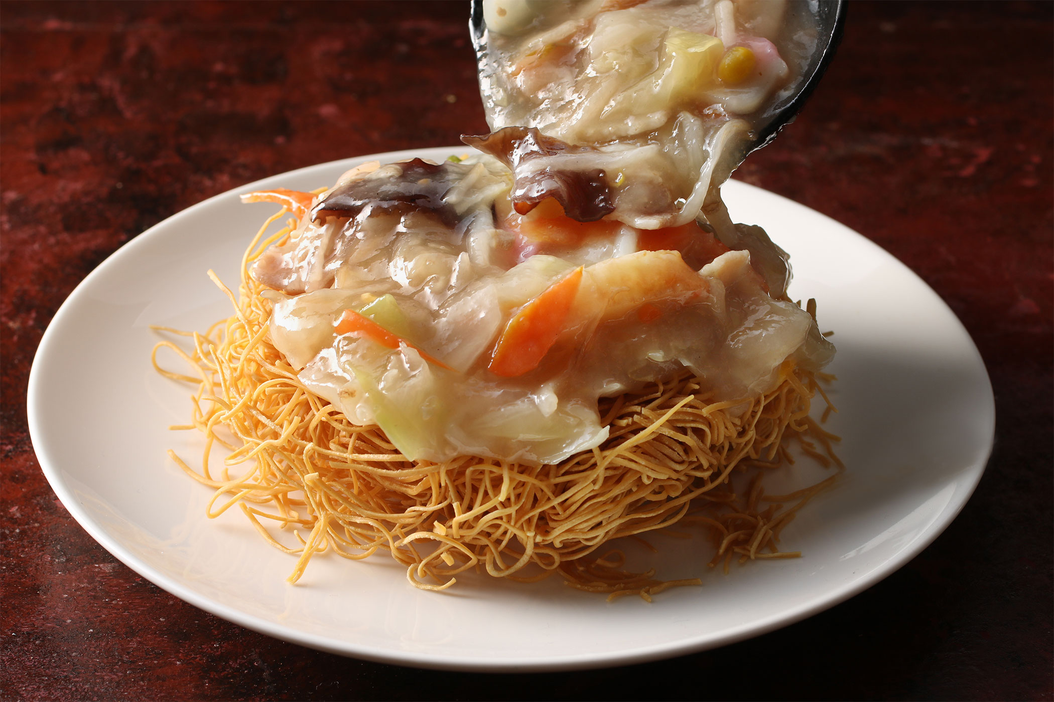右)長崎といえば皿うどん。パリパリの細麺に野菜たっぷりのとろりとした餡をかけてお召し上がりください。長崎旅行で必食の一品です。