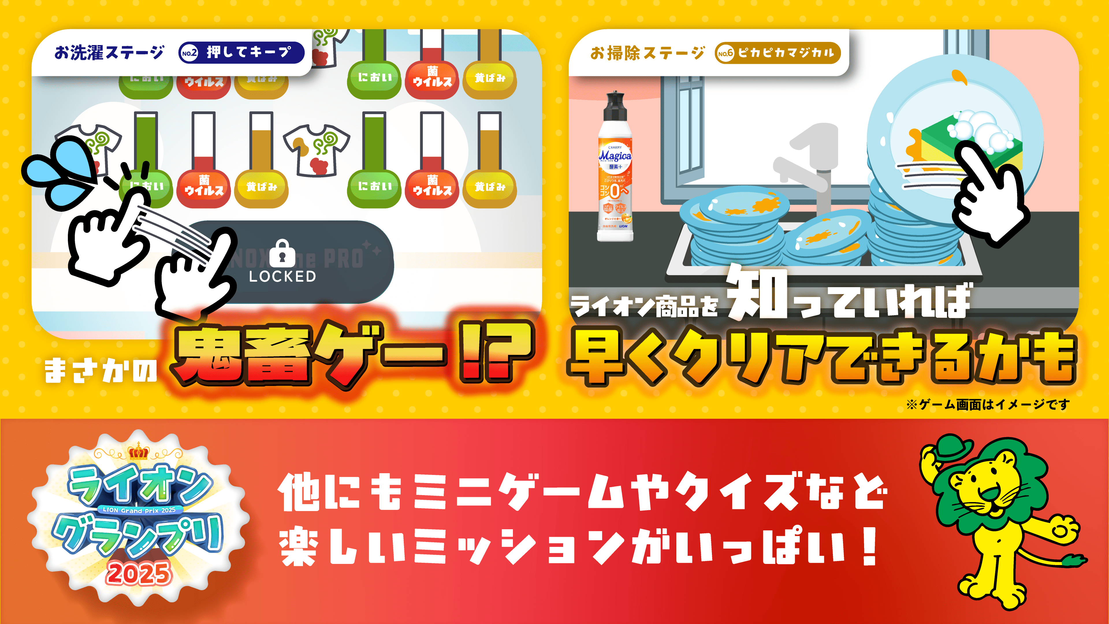 ライオン株式会社(本社:東京都台東区 以下、ライオン)は株式会社休日ハック(台東区蔵前 以下、休日ハック)と共同で、Webや店頭からヒントを得てミッションに挑戦すると賞品などが当たる体験型キャンペーン『ライオングランプリ2025』を2025年11月4日(火)からスタートします。また、開催期間中により多くの方に本企画を楽しんでいただくために、ライオンの公式キャラクターである「ライオンちゃん」がアンバサダーとして登場いたします。
