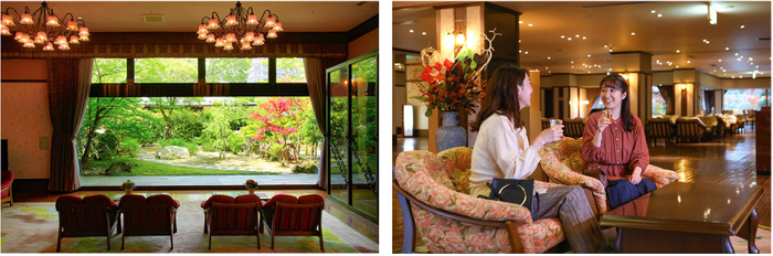 大きなガラス窓と重厚なインテリアがクラシカルな雰囲気を醸し出すロビーラウンジには、ウェルカムドリンクのソフトドリンクや、湯上りに嬉しい生ビールやアイスキャンディなどをご用意しています。