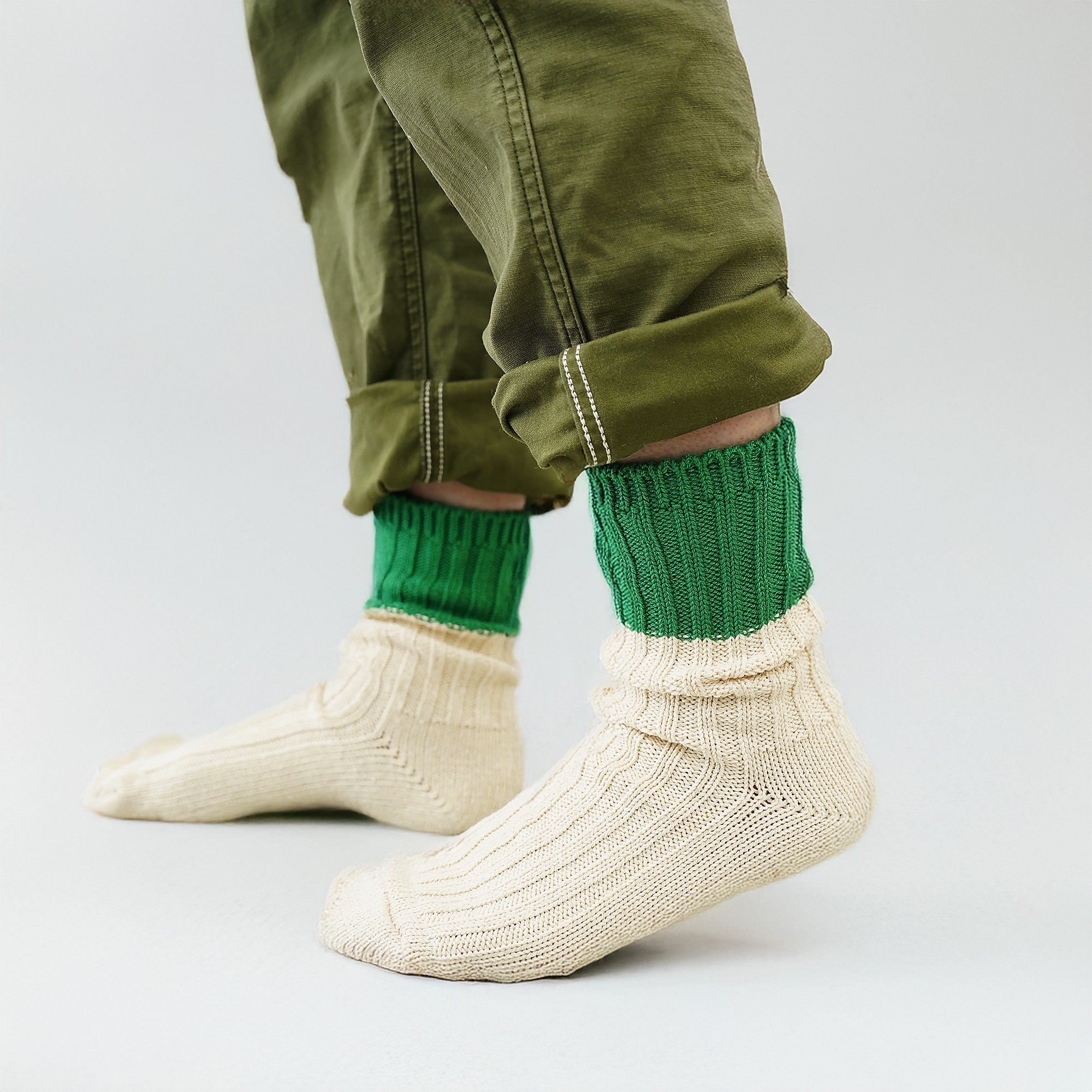 靴下全体はアイボリーを基調にしつつ、履き口部分に鮮やかなカラーを加えたツートンデザイン。シンプルでありながら、足元にさりげない遊び心を添える一足です。