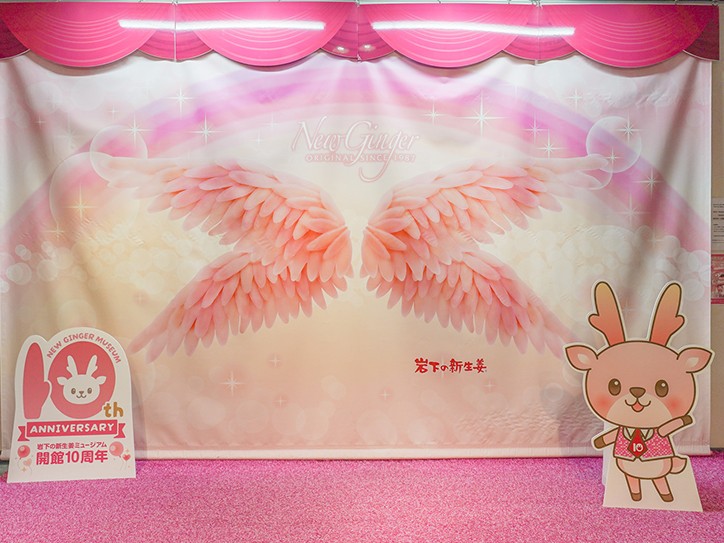 人気のフォトスポット、高さ5mの「世界一大きな岩下の新生姜ヘッド(被り物)」、スライスした岩下の新生姜を200枚並べて4枚の羽を表現した「岩下の新生姜ウイング」には、10周年記念パネルが登場。ご来館の記念に写真を撮ってお楽しみいただけます。