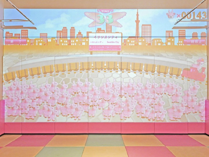 壁面に投影されるイワシカちゃんをタッチして遊べる体感型ゲーム「イワシカあつめ タッチdeキャッチ」が、10周年イベント期間限定で無限∞出現するバージョンになります。これでもか!と次々現れるイワシカちゃんをタッチで集めてお楽しみください。
