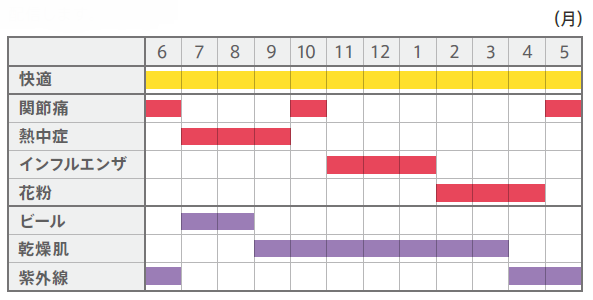 私たちの暮らしは日々の天気や気象の変化に大きく影響を受けており、雨が降る前に頭が痛くなったり、梅雨の時期に関節痛がおきたり、お天気や季節によって体調を崩したり気分がすぐれないこともあります。これらの影響を少しでも軽減し、健康で快適な生活に寄り添うことを目的とした『ピンポイント天気健康生活予報』を、この度、リニューアルいたしました。