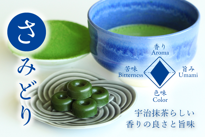 本商品は「やぶきた」「さみどり」「ごこう」の3品種の抹茶チョコの詰め合わせです。