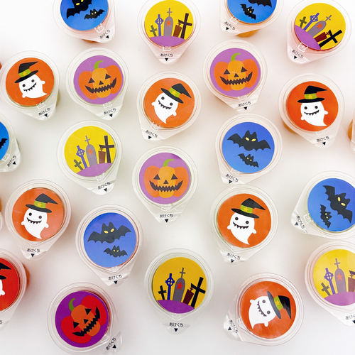 新商品「ハロウィンカラフルゼリー」は、ハロウィンのイラストがデザインされたひとくちサイズのミニカップゼリーです。ストロベリー、青りんご、オレンジの3種類の味がランダムに入っており、ハロウィンパーティーやイベントでのお配りに最適です。