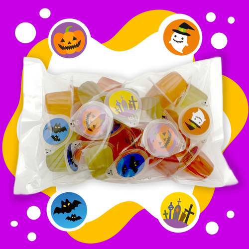 ゼリーのフタには、かぼちゃ、おばけ、コウモリ、お墓などのハロウィンおなじみのイラストがデザインされており、食べるだけでなく見ても楽しいアイテムです。25個入りの大袋でお得感があり、バラマキ用のお菓子としてもピッタリです。