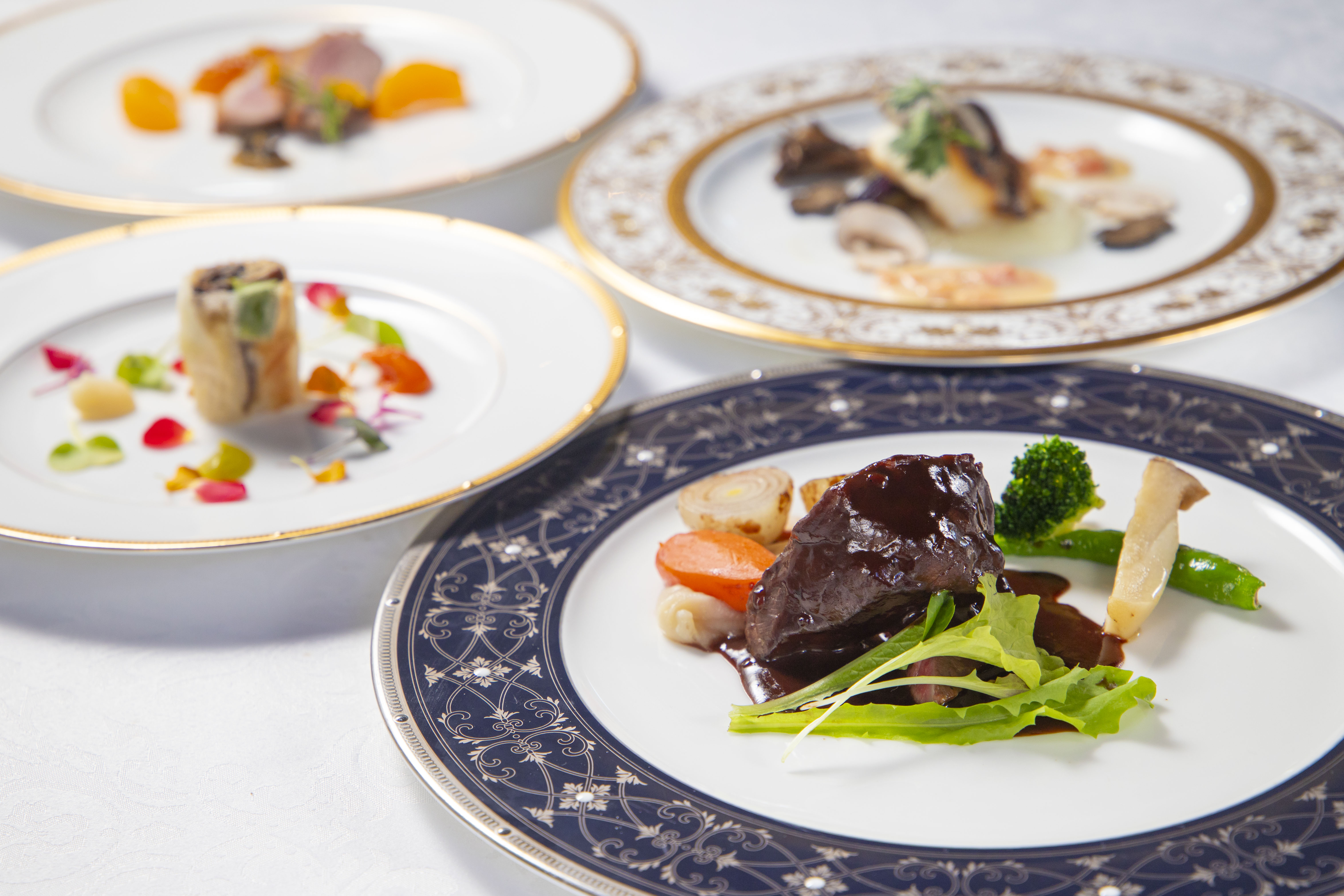 冬の特別コース『冬炉』では、淡路島産の冬野菜や瀬戸内の新鮮な魚介、そして淡路牛を贅沢に使ったコース料理を提供、心も体も温まる特別なひとときをお愉しみ頂けます。コースの始まりには、淡路産冬野菜をローストし、種類豊富な野菜のソースで味わうアミューズ「淡路産冬野菜のロースト いろいろ野菜のソース」。エディブルフラワーで彩られ、冬の自然の恵みを楽しむカラフルな一品で、コースを華やかにスタート。前菜には、濃厚な仔鴨を低温でじっくりと煮込んだコンフィに、淡路島産みかんの爽やかな甘酸っぱさを加えた「仔鴨のコンフィ 島みかんのコンフィチュール」を用意。鴨の深みのある味わいと、みかんのフルーティーでジューシーな風味が絶妙に調和し、心地よい味わいをお楽しみいただけます。スープには、ビーツの甘みとブロッコリーの爽やかな風味が見事に融合した「ビーツのフランとブロッコリーのポタージュ」。魚料理には、瀬戸内海の新鮮な真ハタを使用した「瀬戸内産真ハタのソテー コールラビと魚介のソース」を提供。真ハタを香ばしくソテーし、淡路島産のコールラビと魚介のソースが繊細で豊かな風味を引き立てます。お口直しには、香ばしい焼き芋の風味と、クリーミーなアイスの口当たりが絶妙にマッチし、冬の味わいを感じさせる「焼き芋のアイスクリーム」を用意。メインの肉料理は「淡路牛の赤ワイン煮込み クラシックスタイル」。淡路牛を赤ワインでじっくり煮込んだことにより肉質が柔らかく、豊かな旨味が凝縮された一品です。最後には、冬に旬を迎えるいちごを使った「冬いちごのデグリネゾン」で、フレッシュないちごの甘さと酸味を楽しむ爽やかなデザートがコースを締めくくります。