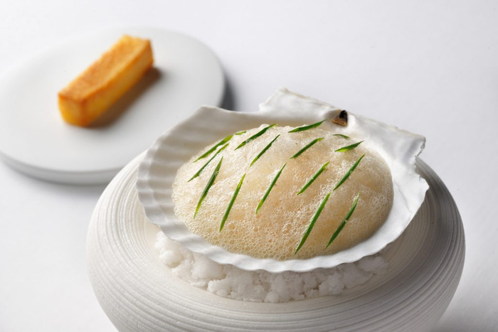 大きな貝殻を器にしてつくる、青森の郷土料理です。魚介の香りを強く感じられる、いりこは味噌と相性が抜群。軽い食感と味噌が利いた泡が香りのポイントです。