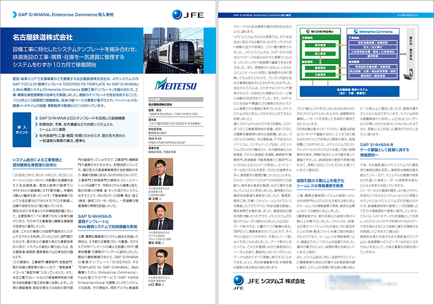 JFEシステムズ株式会社(東証スタンダード市場 4832、本社:東京都港区、代表取締役社長:大木 哲夫、以下 当社)は、名古屋鉄道株式会社(東証プライム市場・名証プレミア市場9048、本社:愛知県名古屋市、代表取締役社長:高崎 裕樹(※高は「はしごだか」、崎は「たつさき」が正式表記)、以下 名古屋鉄道様)が、当社開発のプロジェクト管理業務テンプレート「SIDEROS(R) PS TEMPLATE for SAP S/4HANA(R)(以下 SIDEROS(R) PS TEMPLATE)」およびWeb調達・購買システムテンプレート「Enterprise Commerce設備工事テンプレート」を適用して構築された「工事・購買在庫管理システム」の構築事例を公開しました。
