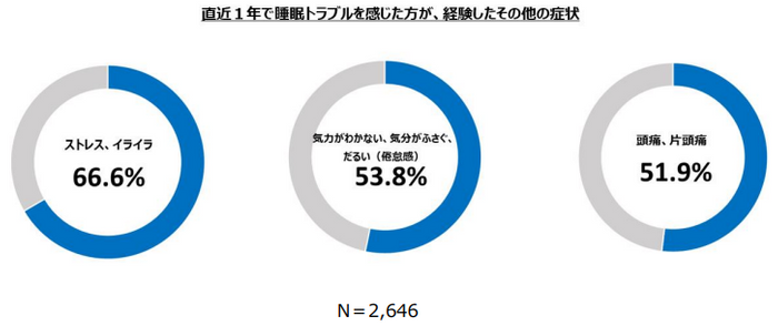 調査では、直近1年間に感じた身体の不調について、全体の23.3%の方が「睡眠トラブル(眠りが浅い、寝つきが悪い、朝早く目覚める)」を選択しており(複数回答)、約4人に1人が睡眠トラブルを経験していることが分かりました。また、睡眠トラブルを経験した方は「ストレス、イライラ」「気力がわかない、気分がふさぐ、だるい(倦怠感)」「頭痛、片頭痛」などの症状も経験していることが分かりました。