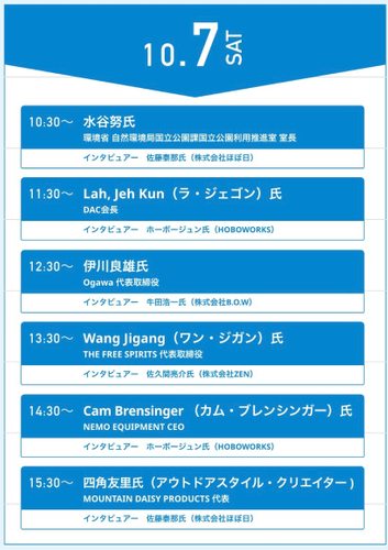さらにインタビュアーは、HOBOWORKSを展開するホーボージュン氏、元ランドネ編集長の佐藤泰那氏、株式会社B.O.W代表の牛田浩一氏、株式会社ZEN代表の佐久間亮介氏の豪華メンバー。アウトドアファン必見の熱いトークをお見逃しなく。