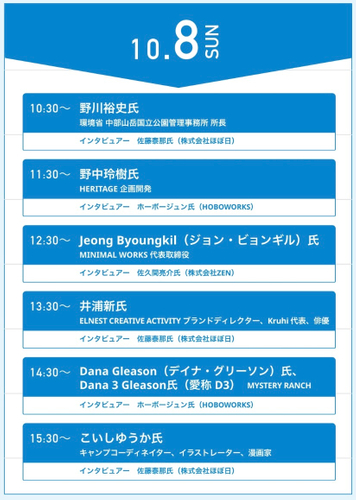 7日(土)、8日(日)の一般入場日には「ELNEST CREATIVE ACTIVITY」や「Kruhi」を展開する俳優の井浦新氏、MOUNTAIN DAISY PRODUCTS代表でアウトドアスタイル・クリエイターの四角友里氏。そして海外からは、日本のアウトドアイベントでの登壇は初となるNEMO Equipment創設者のCam Brensinger氏、MYSTERY RANCH創設者のDana Gleason氏とプロダクトディレクターのDana 3 Gleason氏が登壇。その他にもogawa 代表取締役 伊川良雄氏、DAC 会長 Jake Lah(ジェイク・ラー)氏、The Free Spirits 代表取締役 Wang Jigang(ワン・ジガン)氏、HERITAGE 企画開発 野中玲樹氏、MINIMAL WORKS 代表取締役 Byeongil Jeong(ジョン・ビョンギル)氏、キャンプコーディネイター・イラストレーター・漫画家のこいしゆうか氏などが集まり、ブランドのクラフトマンシップや、アウトドア業界の今と未来についてなど、他イベントにはないアウトドアの本質をついたテーマで、ファンの心をくすぐるトークを繰り広げます。