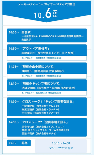 ALPS OUTDOOR SUMMITのメインステージでは、レジェンド的存在のアウトドアマンが集まり、トークを繰り広げます。6日(金)のプレス・業者日は株式会社エイアンドエフの赤津孝夫会長、穂高岳山荘 代表取締役 今田恵氏、株式会社五光牧場 代表取締役 吉澤光雲氏による講演や、アウトドア業界トップランナーたちによるクロストークを実施。