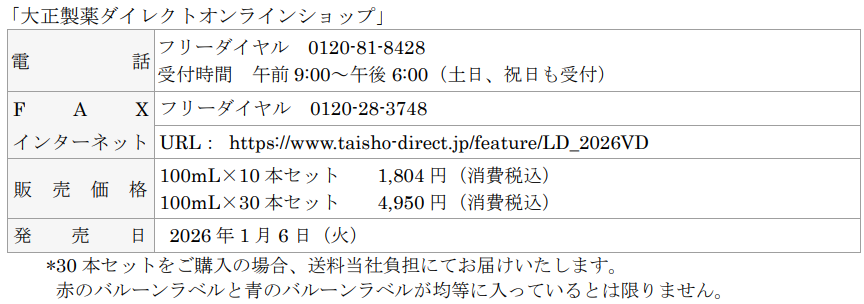 大正製薬株式会社[本社:東京都豊島区 社長:上原 茂](以下、当社)は、2026年のバレンタインデーをさらに盛り上げる特別なアイテム「リポビタンD バレンタイン限定ボトル2026」を2026年1月6日(火)から、数量限定、通販限定で当社通販サイト「大正製薬ダイレクト」等にて販売開始いたしました。