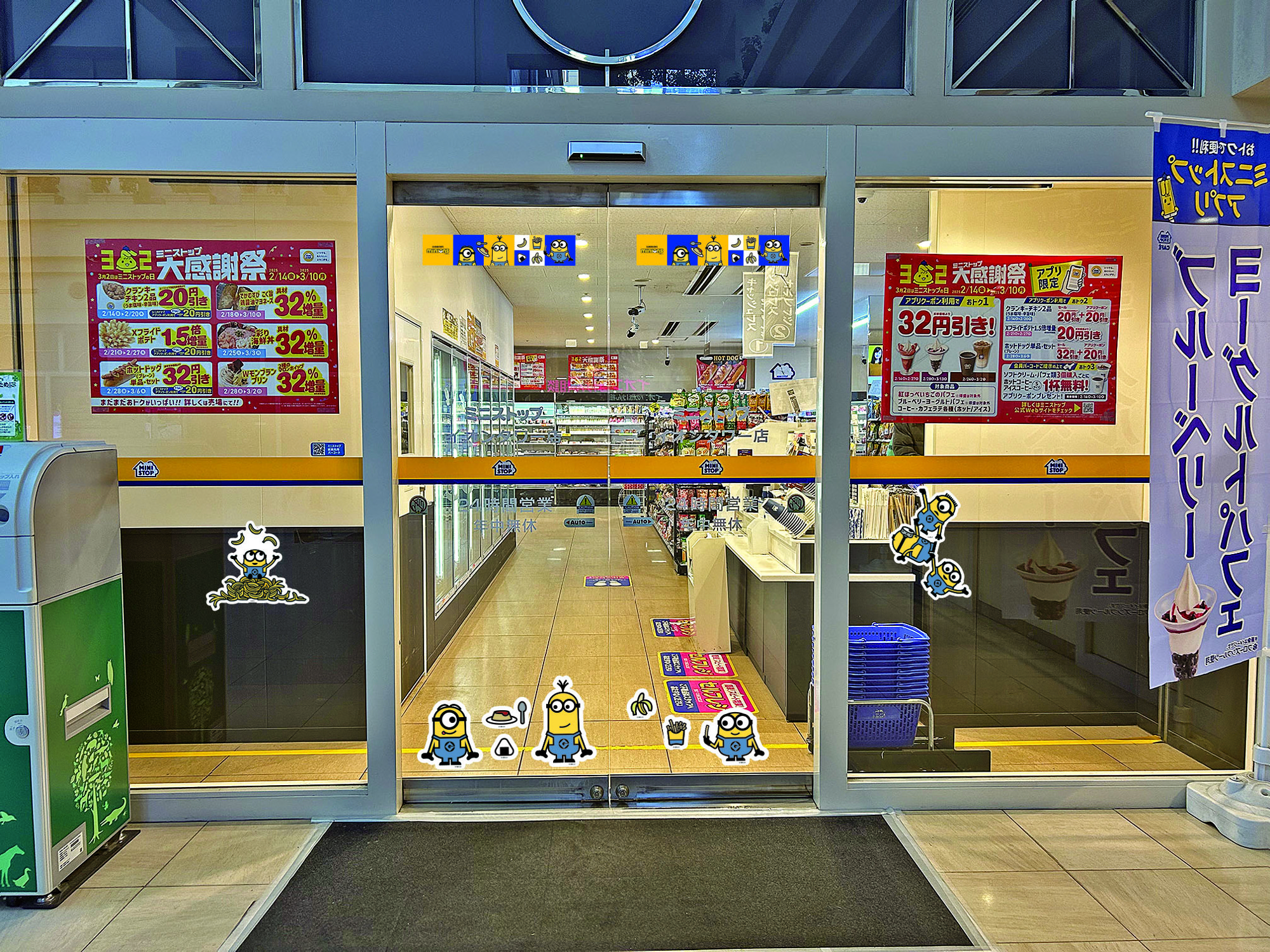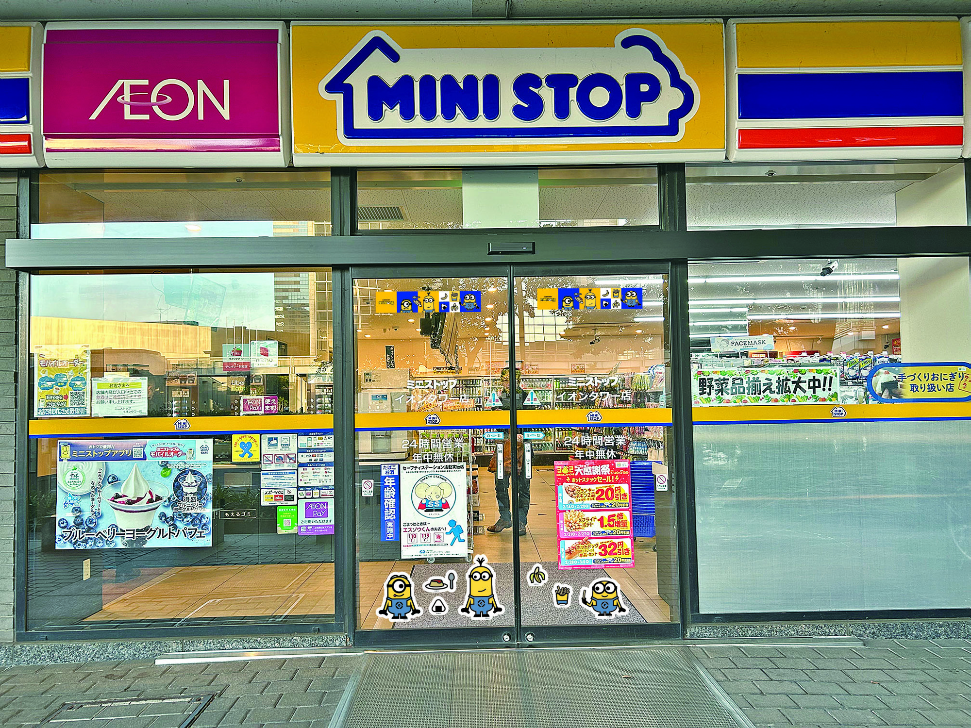 <ミニオンステッカーで装飾された店舗でワクワク!>