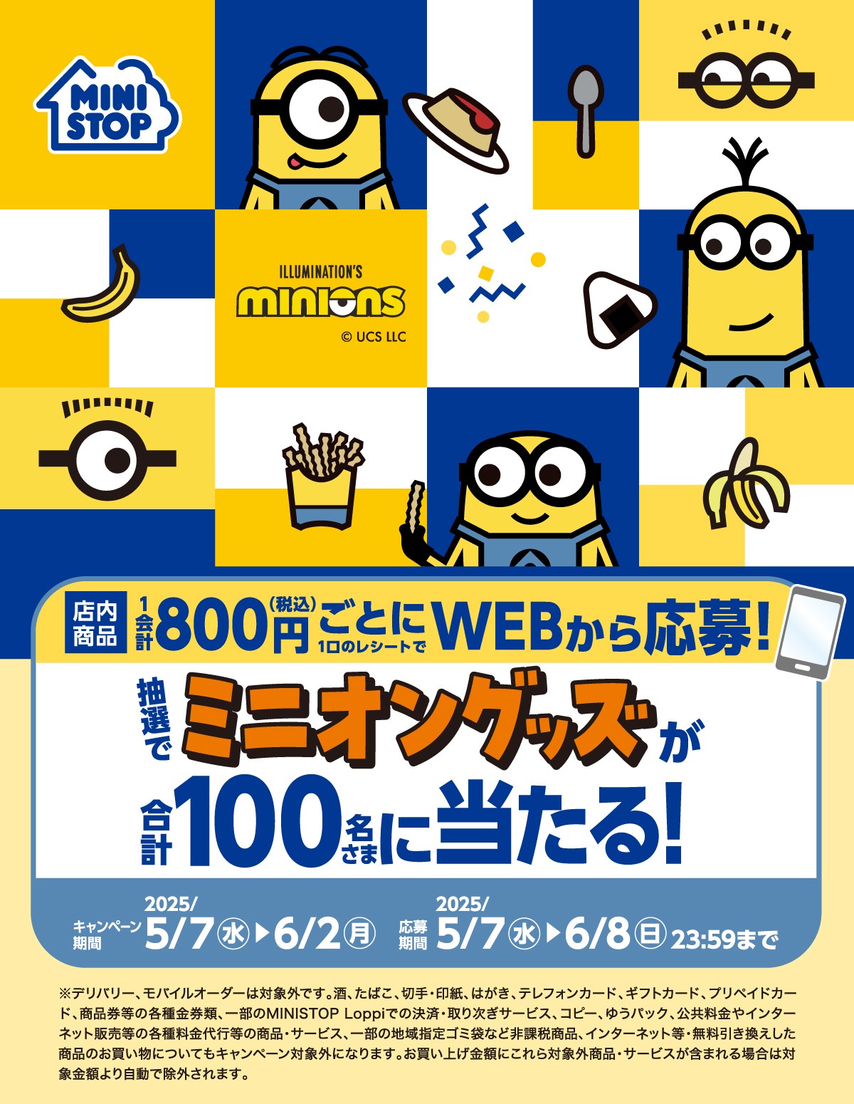 ①店内商品1会計800円(税込)ごとに1口のレシートで、WEBから応募していただくと、抽選で「ミニオングッズ」が合計100名さまに当たります!