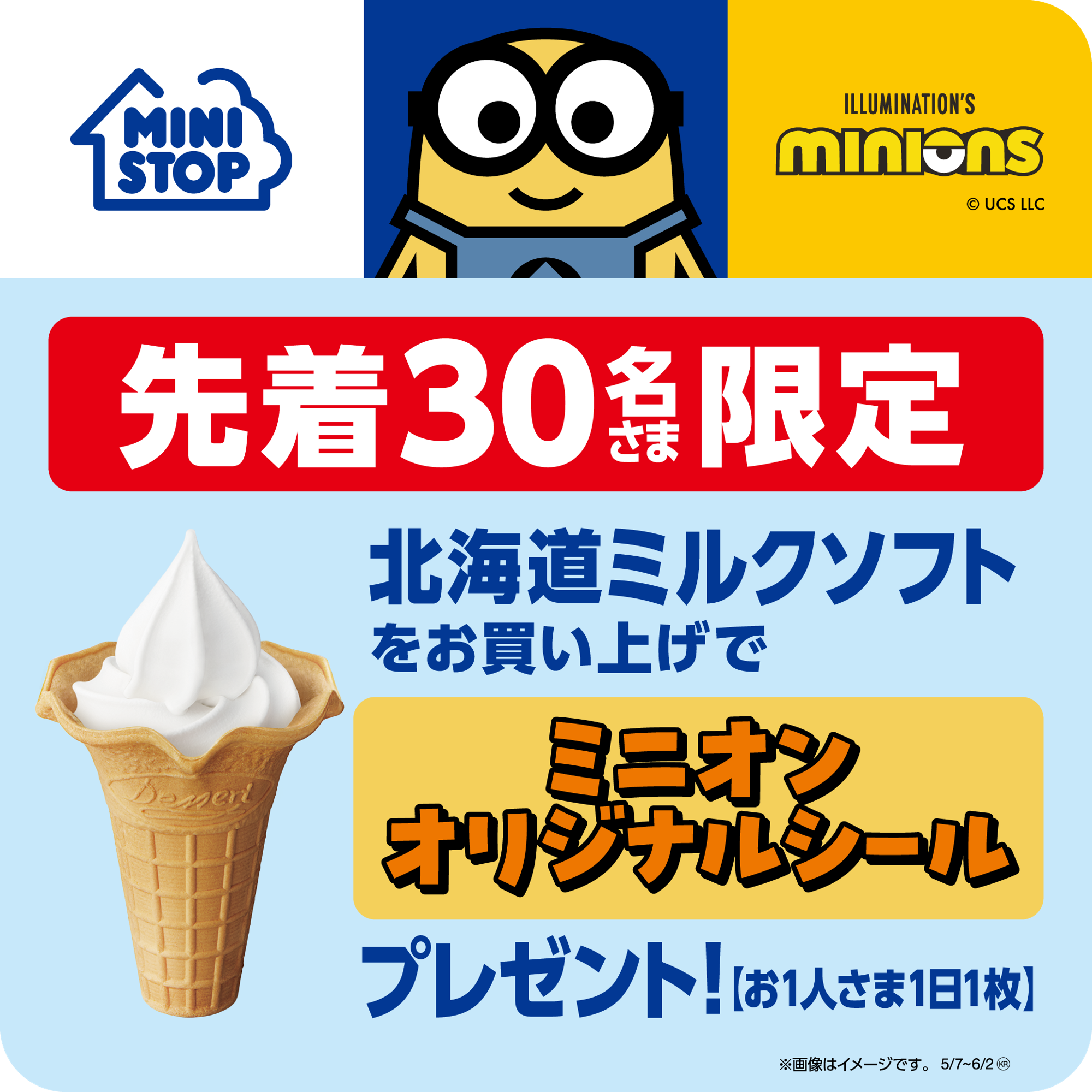②北海道ミルクソフトをお買い上げで、各店舗先着30名さまに「ミニオンオリジナルシール」をプレゼント!