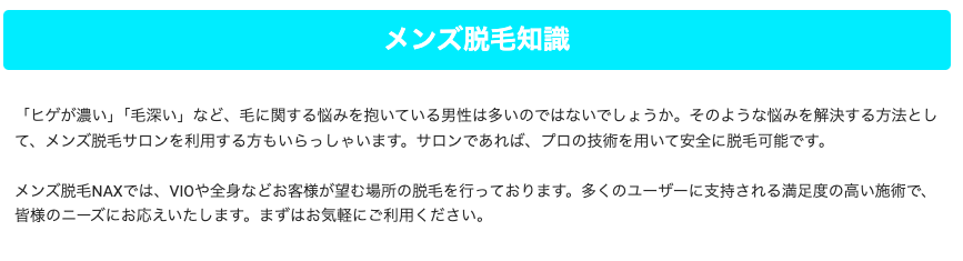 メンズ脱毛NAXのグループ会社では、理・美容室の運営もおこなっているので、そこから得た美容に関する知識を最善に活かし、脱毛もビューティーとしての位置づけとして考えおこなっています。
