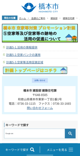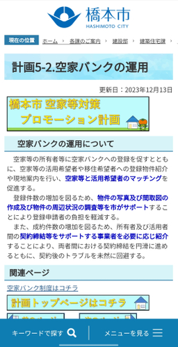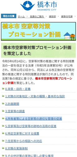 自治体が策定する計画の多くは冊子化した紙媒体の配布やPDF形式でホームページ上に掲載することにより公開されますが、上記URLのとおり、市HP上に『橋本市空家等対策プロモーション計画』というカテゴリを作成し、その中に項目ごとのページを作成するという方式で公開します。PDF形式と異なり、閲覧する端末の設定により文字サイズが自動調整されるため、スマートフォンやタブレットで閲覧しやすいこと、【空家等及びその跡地の活用の促進】という項目のページに実際の空家バンク制度のページの内部リンクを貼り付けるなど記載ページ内に関連する制度等のURLを掲載することで、各関連制度のページ閲覧数増加に直結することを狙っています。