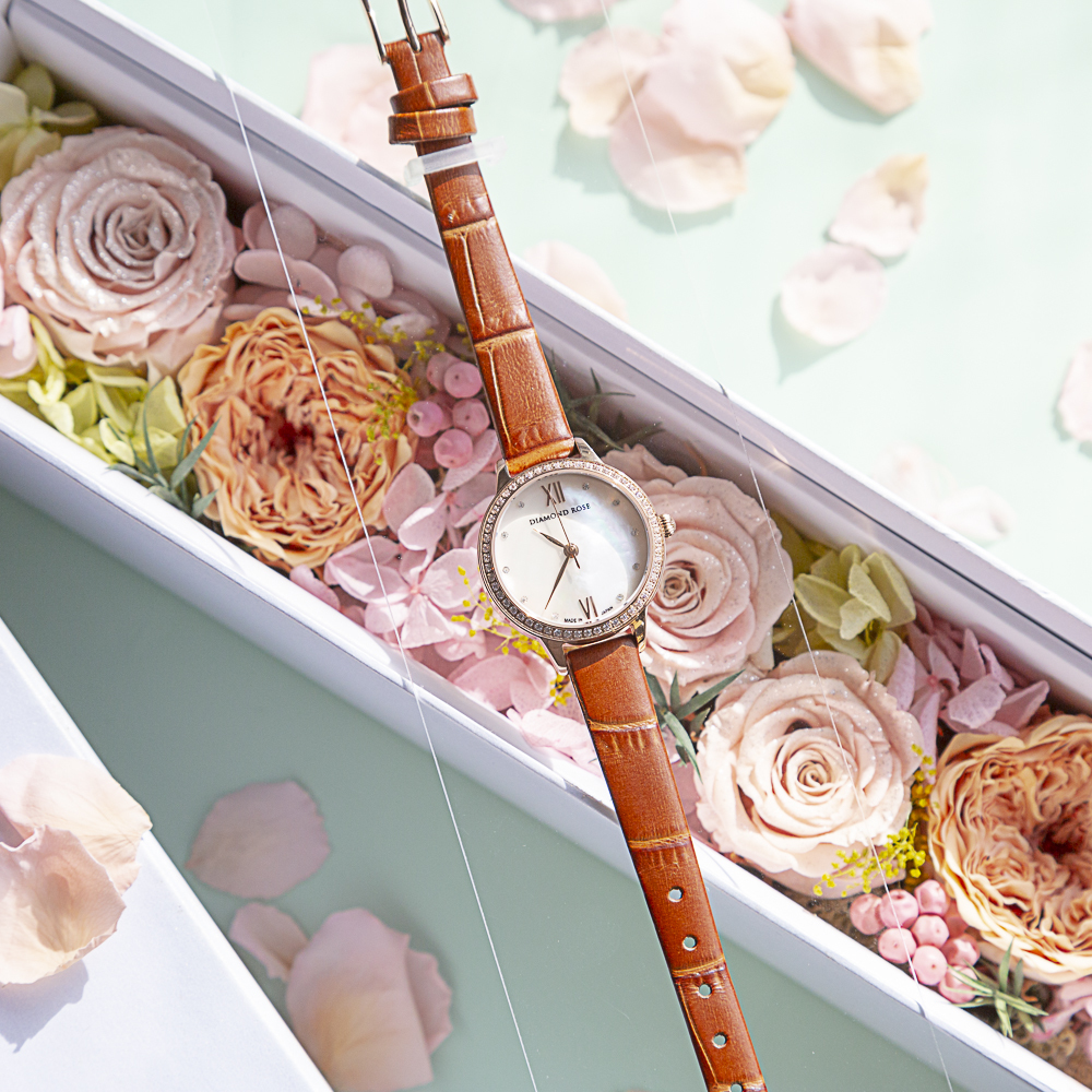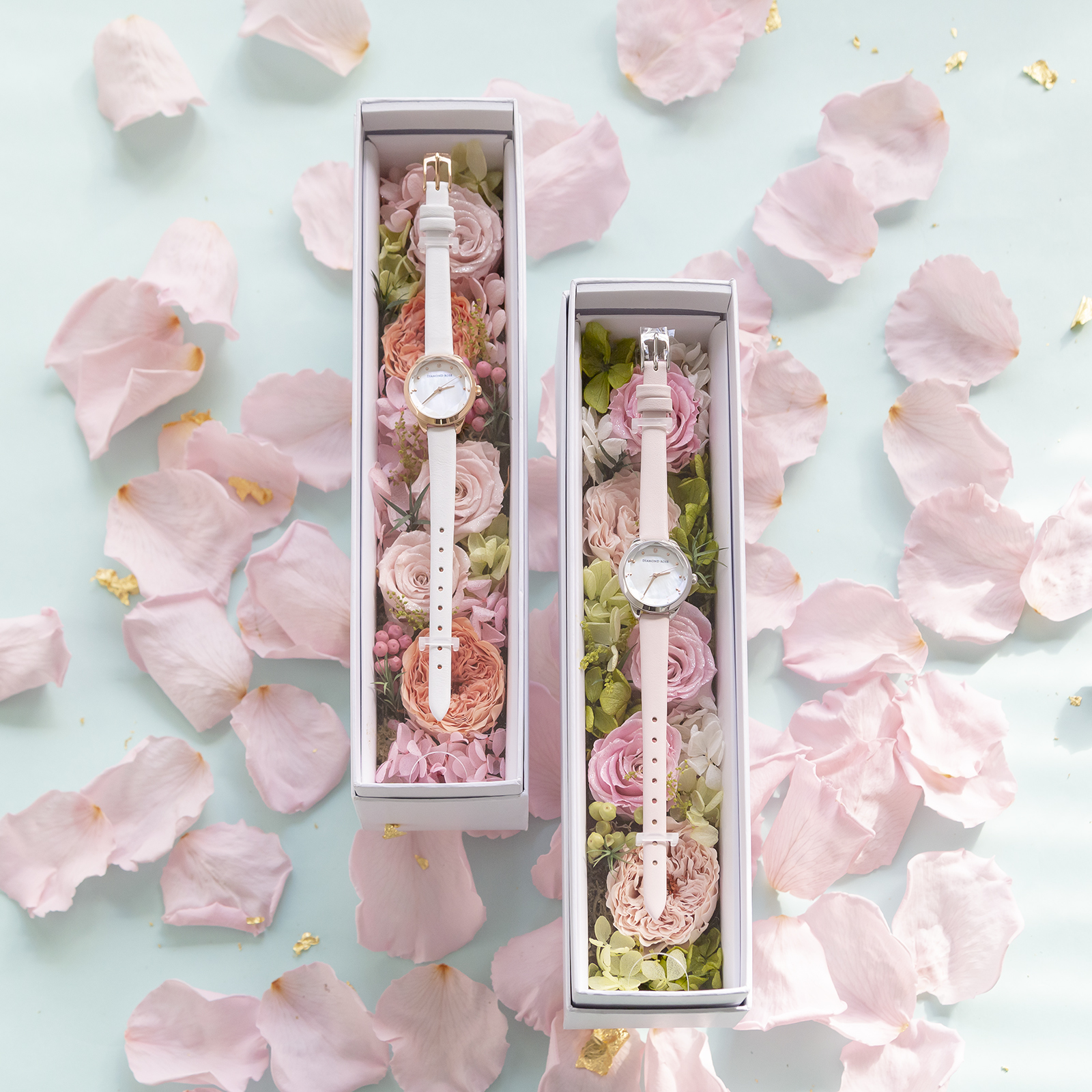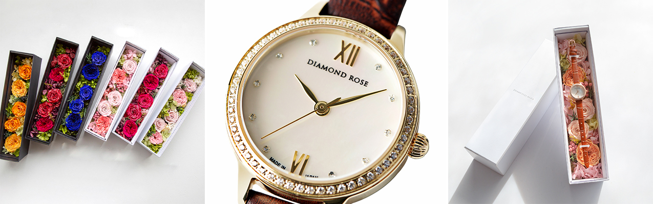 文字盤に天然ダイヤモンドが輝く日本製ウォッチを、花びらにダイヤモンドとラメが輝く「ダイヤモンドローズ」がアレンジされた専用ケースに収めました。