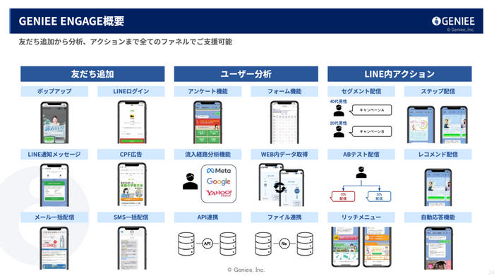 GENIEE ENGAGEは、友だち追加から分析、アクションまで全てのファネルをカバーする統合型LINEマーケティングプラットフォームです。セグメント配信、ステップ配信、ABテスト配信などの高度な配信機能に加え、Web行動連携やデータフィード連携による精緻なマーケティング施策の実現が可能です。また、他社ツールと比較して高いコストパフォーマンスを実現しており、DOTZ社はより効率的かつ効果的なLINEマーケティングサービスを顧客に提供できるようになります。