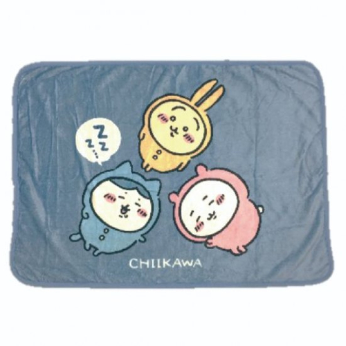 グレーのブランケットには、ちいかわとハチワレ、うさぎの3キャラが勢揃い♪みんな気持ちよさそうで、よく見るとハチワレはすやすや眠っています。