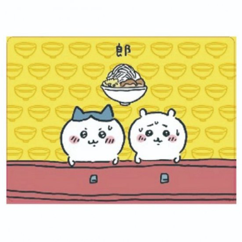 緊張気味のちいかわとハチワレ、そして上には丼が。漫画でもおなじみのラーメン屋さん「郎」のデザインですね♪
