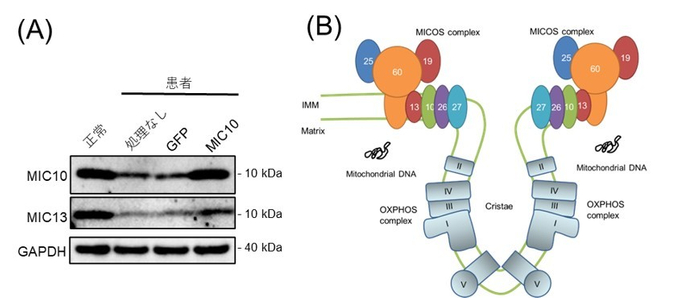 本成果において、神経-肝型ミトコンドリアDNA枯渇症の原因として、MICOS10 遺伝子の異常を世界で初めて報告しました。また、先行研究では、MICOS13遺伝子を神経-肝型ミトコンドリアDNA枯渇症の原因として報告していました(参考文献)。MICOS13遺伝子はMIC13タンパク質をコードしており(図3)、MICOS複合体とミトコンドリアDNA枯渇症の関連が示唆されていました。今回の発見においても、MICOS複合体のコンポーネントであるMIC10との関連が示され、MICOS複合体とミトコンドリアDNA枯渇症の関連が深いことが明らかになりました。これらは、ミトコンドリアクリステ形成が、ミトコンドリアDNAの維持に重要であることを示しています。現在、新規治療薬として期待されているMA-5は、ミトコンドリアクリステ形成を促進するものであり、これがミトコンドリアDNA枯渇に対しても効果を発揮する可能性を本研究が示唆しています。