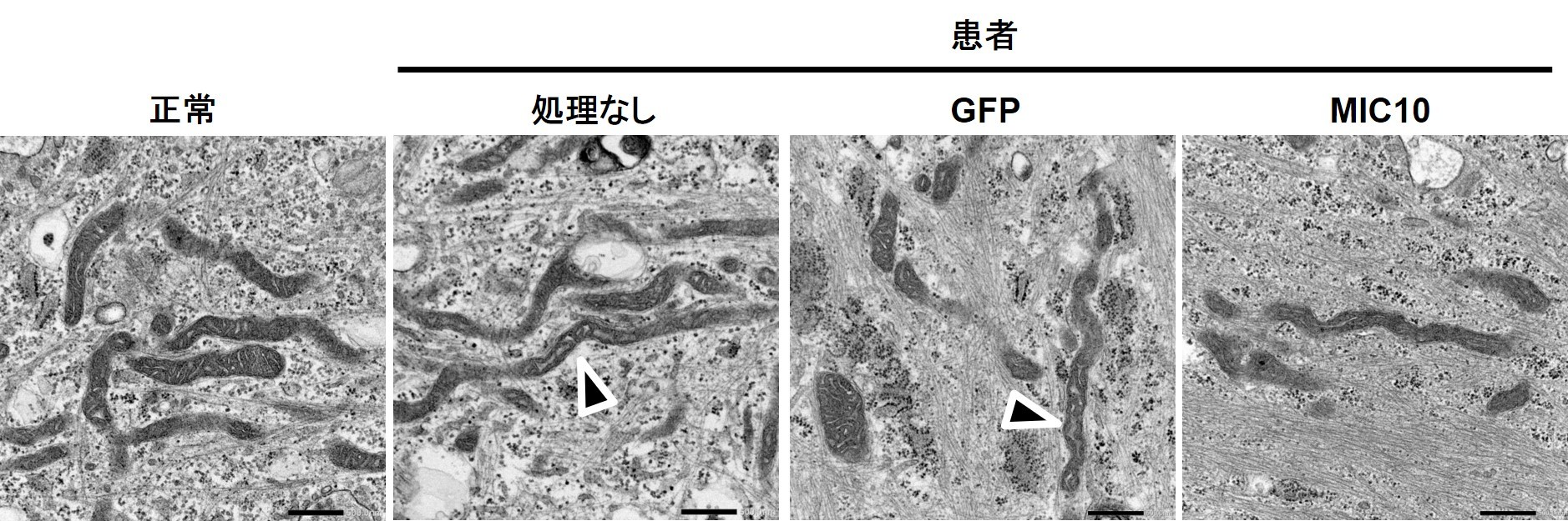 電子顕微鏡により、ミトコンドリアクリステの形態変化を観察しました。その結果、患者由来線維芽細胞において、クリステが消失しているミトコンドリアが多数観察されました(図4)。さらに、正常型のMICOS10を患者由来線維芽細胞に発現させることによって、クリステ形態の異常を回復できることも明らかにしました。また、それに伴ってミトコンドリアにおける酸素消費量も回復したことが確認されました。