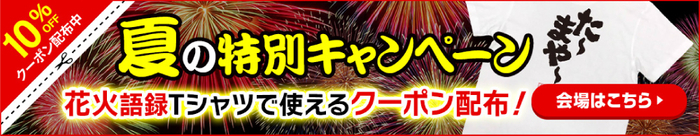 夏本番に向けて、7月5日から先着100注文に、花火Tシャツを通常価格より10%オフになるクーポンを配布いたします。この機会に、ご自宅用はもちろん、ギフト用としてもぴったりなTシャツをお求めください。