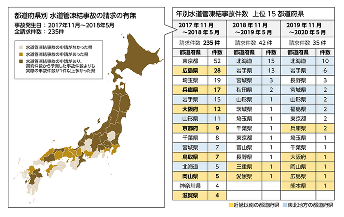 そこで、直近の3年間で当社へ請求があった水道管凍結事故件数を県別に分析したところ、例年の水道管凍結事故は北海道・東北地方に多く発生していますが、ラニーニャ現象の発生した2017年秋~2018年春に限っては、寒波や豪雪の影響を受けて全国的に例年の6倍近くもの水道管凍結事故が発生し、関東・近畿・中国・四国・九州地方にも多くの事故が起きていたことが分かりました。