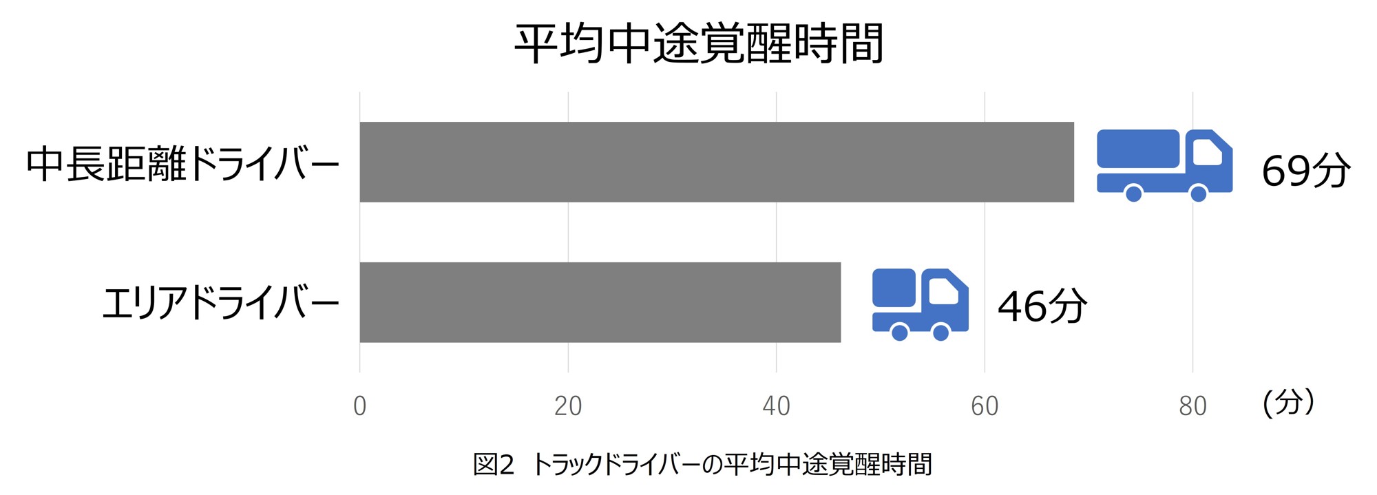 さらに、トラックドライバーの中途覚醒時間について、解析を行いました。中途覚醒時間は睡眠中に目が覚めて起きている時間を示しています。中長距離トラックドライバーは、中途覚醒時間が平均69分であり、エリアドライバーの中途覚醒時間は平均46分でした(図2)。本調査結果において、エリアドライバーよりも中長距離トラックドライバーの方が、中途覚醒時間が長いことが分かりました。