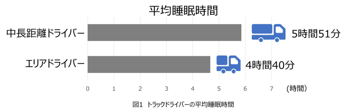 中長距離トラックドライバーの平均睡眠時間は5時間51分、エリアドライバーの平均睡眠時間は、4時間40分でした(図1)。2023年に厚生労働省が「健康づくりのための睡眠ガイド2023」を公表し、成人の睡眠時間は6時間以上を目安にすることが推奨されました。本調査結果からも、トラックドライバーの睡眠時間が不足しがちである可能性があります。