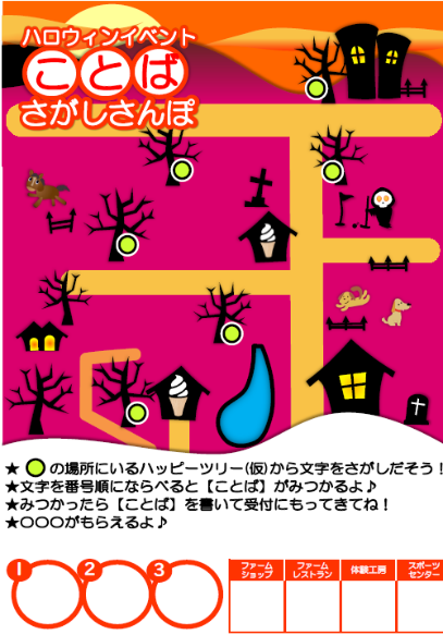 にぎわい広場にある無料の参加キットを手に入れて、牧場内にいるハッピーツリーたちから文字を集めて、正解の『ことば』を探して、プレゼントがもらえます。さらにスポーツセンター、体験工房。千本松温泉の割引券としてもお使いいただけます。