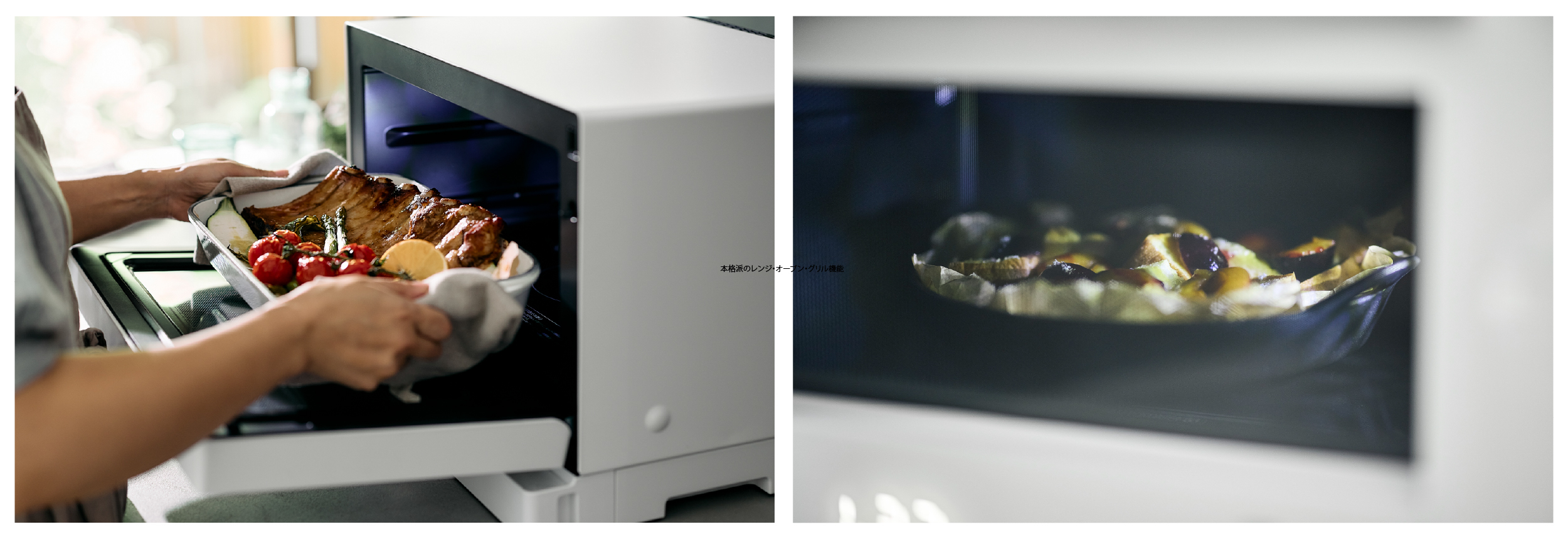 赤外線センサー搭載で、食材の温度をダイレクトにセンシングし、均一で高精細なあたためを実現した「レンジ」機能。最大250℃まで上がり、1.2kgの塊肉でもムラなく火を通せる「オーブン」機能。高火力なヒーターの力で、プロ並みの料理を叶える「グリル」機能を搭載し、あらゆる調理をカバーします。