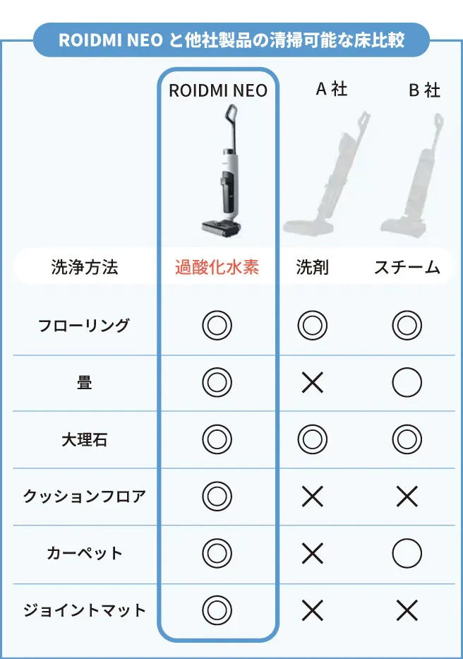 ROIDMI NEOは、水道水を電解処理し**「過酸化水素水(H₂O₂)」を生成する独自技術を採用。