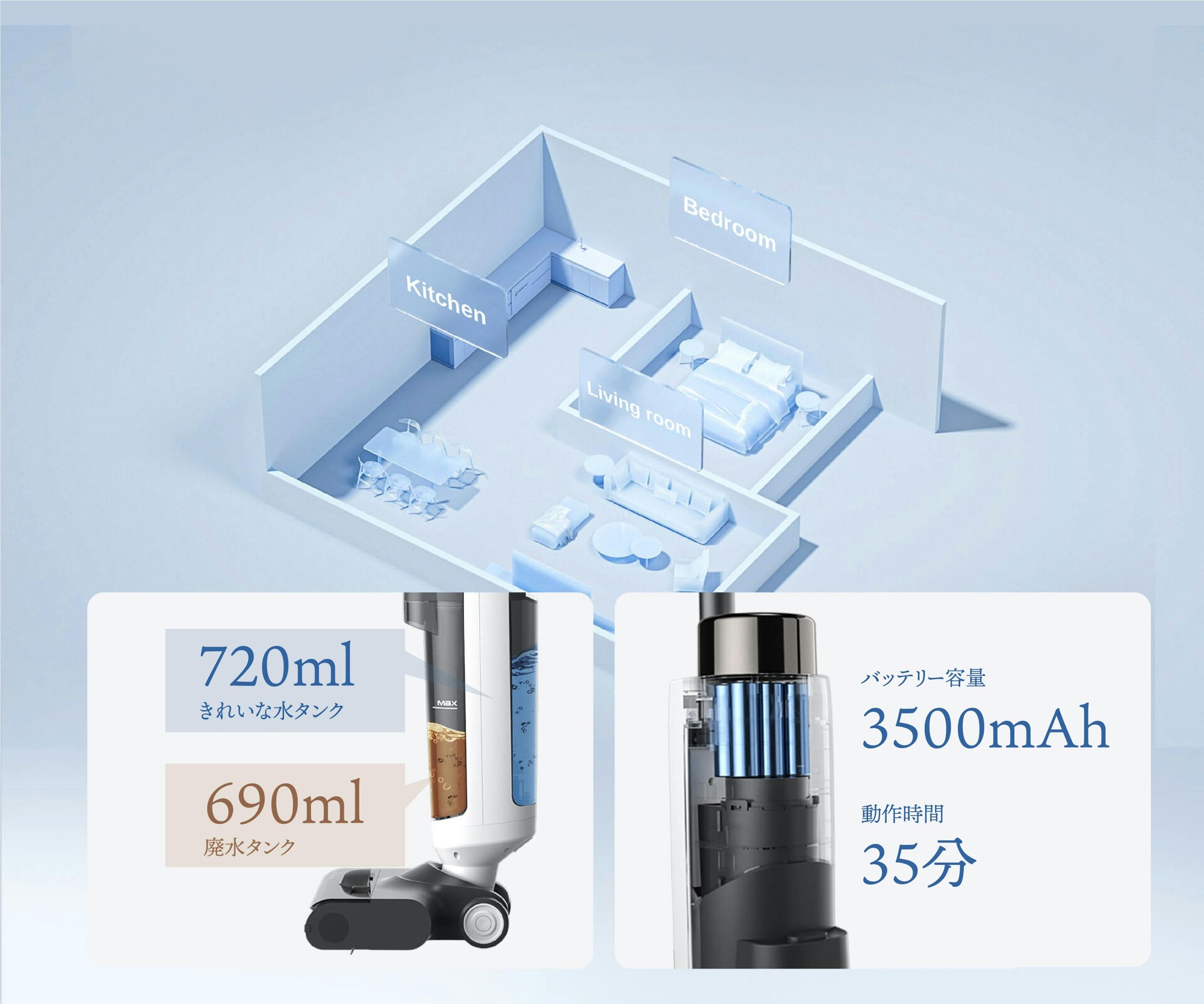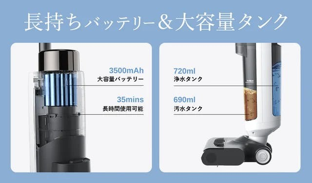 掃除に使用する水も大容量720mlタンクとなっており、掃除の途中で補充する手間がいりません。