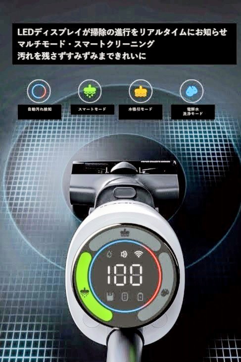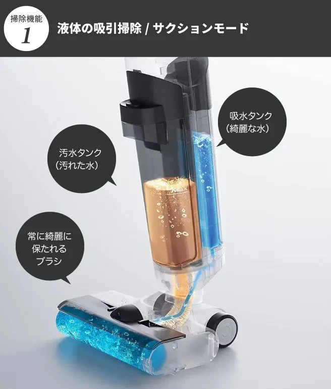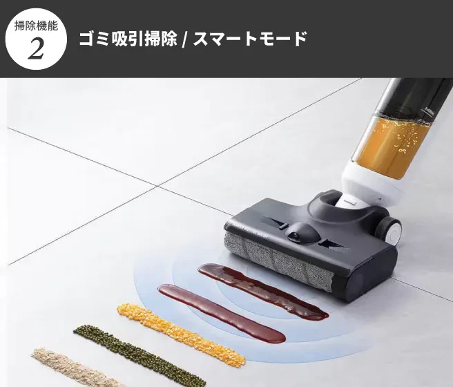 このモードでは、ブラシヘッドの先端から適量の水を噴射しながら、床を湿らせつつ掃除することで、こびりついた汚れも効果的に除去します。